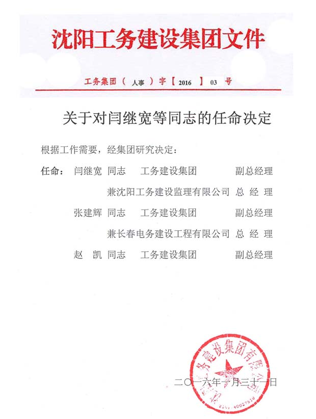 工務(wù)集團(人事)字【2016】03號《關(guān)于對閆繼寬等同志的任命決定》